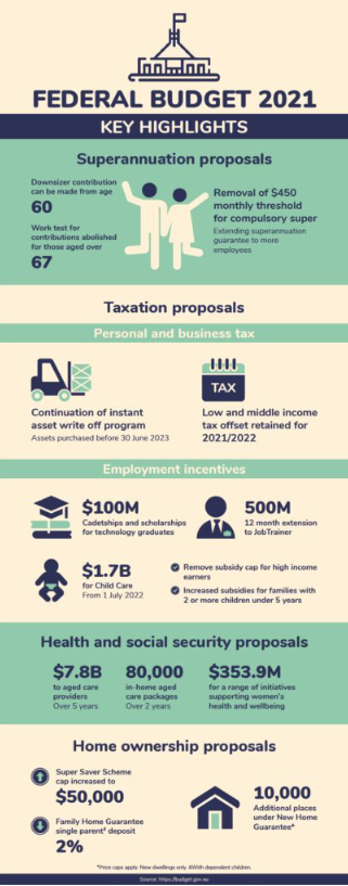 Greater flexibility for older Australians to boost superannuation, continued support for small business, and extra help for struggling homebuyers are key drivers in the Federal Government’s 2021 Budget, designed to steer Australia away from a pandemic recession.